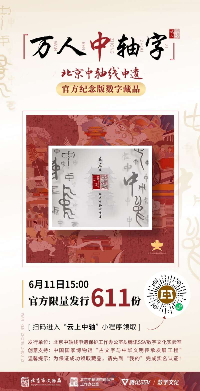 现场嘉宾写下的各种风格的汉字“中”,与预热阶段公众书写的“中”字,汇聚成一幅“万人中轴字”数字藏品。这也是继“数字雨燕”后由北京中轴线申遗保护工作办公室官方发行的第二款纪念数字藏品,限量611份,瞬间领取一空。伴随着“中”字的升腾,雨燕飞舞引领众人飞越北京中轴线,2022北京中轴线文化遗产传承与创新大赛再度扬帆起航。