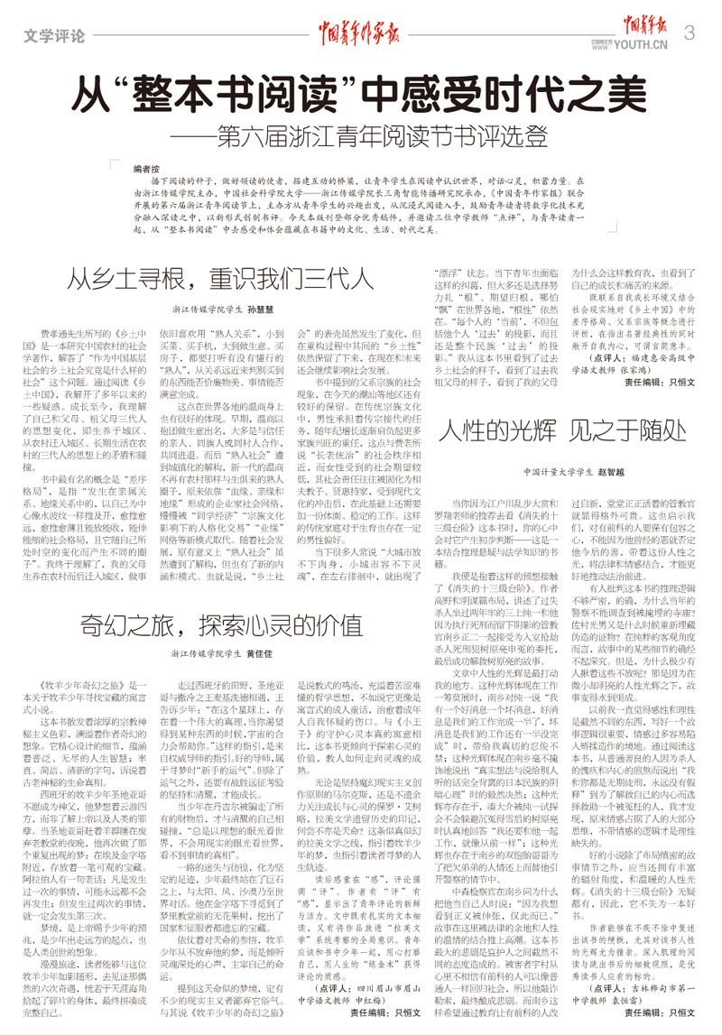 播下阅读的种子,做好领读的使者,搭建互动的桥梁,让青年学生在阅读中认识世界,对话心灵,积蓄力量。在由浙江传媒学院主办,中国社会科学院大学——浙江传媒学院长三角智能传播研究院承办,《中国青年作家报》联合开展的第六届浙江青年阅读节上,主办方从青年学生的兴趣出发,从沉浸式阅读入手,鼓励青年读者将数字化技术充分融入深读之中,以新形式创制书评。今天本版刊登部分优秀稿件,并邀请三位中学教师“点评”,与青年读者一起,从“整本书阅读”中去感受和体会蕴藏在书籍中的文化、生活、时代之美。