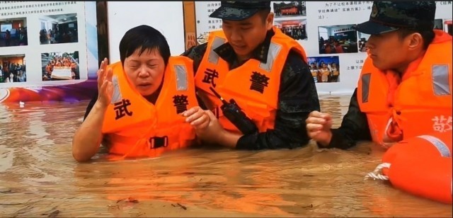 武警官兵背起被困群众,转移到安全地带。张陈宇 摄