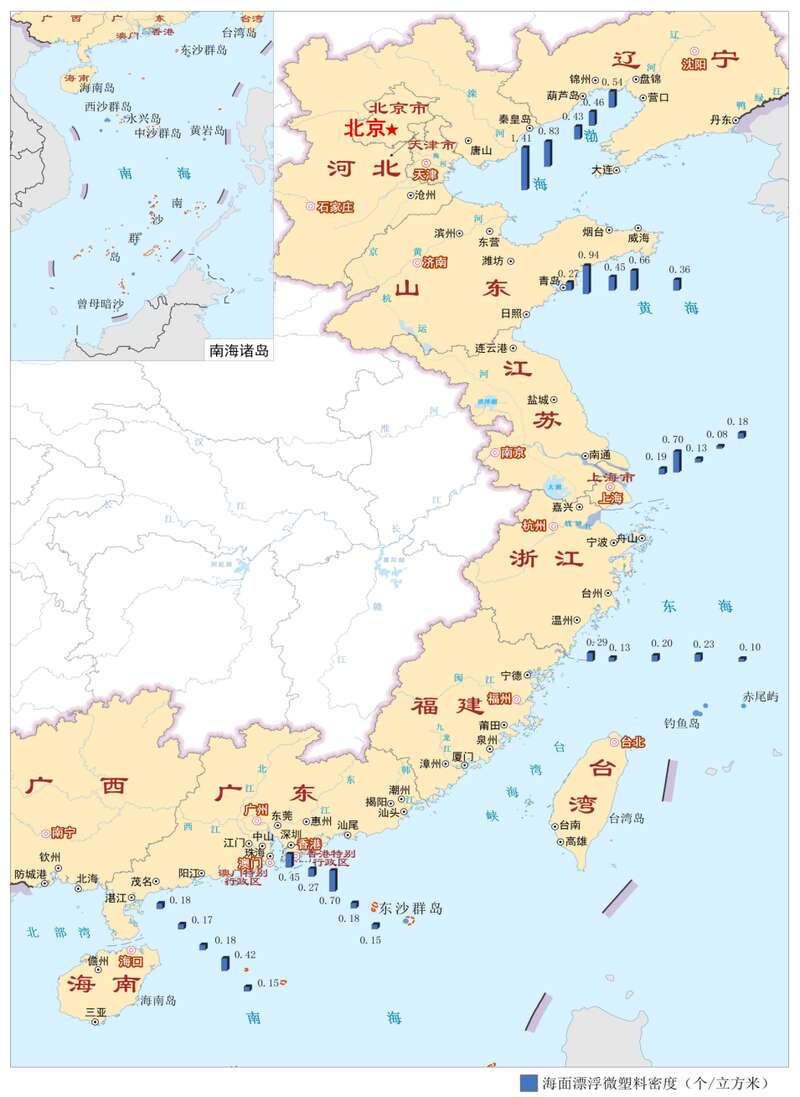 2021年监测区域海面漂浮微塑料分布图。图片来源:《2021年中国海洋生态环境状况公报》