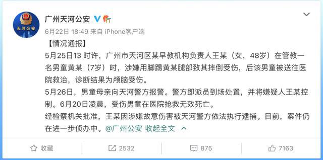 日前,广州市公安局天河分局在微博上发布了关于“广州一早教机构负责人将幼童踢伤致死”的情况通报,引起舆论的高度关注。