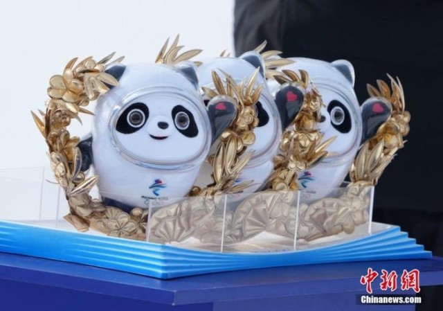 资料图:冬奥现场为获奖选手颁发的冰墩墩纪念品。 中新社记者 毛建军 摄