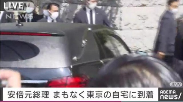 当地时间9日下午,载有日本前首相安倍晋三遗体的灵车抵达其位于东京的住宅。图片来源:日本朝日电视台报道截图