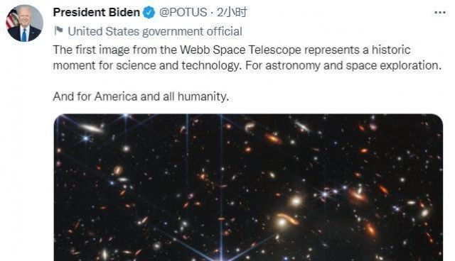 中新网7月12日电 据路透社报道,当地时间11日,美国总统拜登在其社交媒体账户发布美国国家航空航天局(NASA)的詹姆斯·韦伯太空望远镜传回的首张全彩色照片。