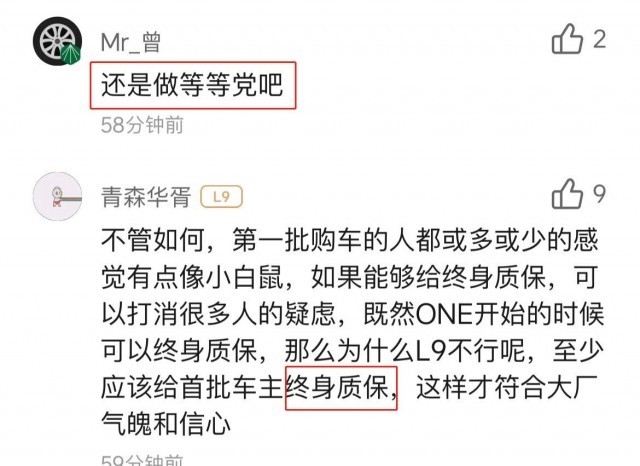 有相同想法的并不止张先生一人,在理想汽车APP中,不少理想车友都发表了等等看的想法,更有车友希望理想L9像理想ONE一样,提供终身质保。“虽然说这只是试驾车,不是量产车,但买车也不是件小事,还是准备先等等,等前几批车主开一段时间看看评测再说,更何况首批车的小毛病都多。而且如果理想ONE能提供终身质保,那为什么理想L9不行?”