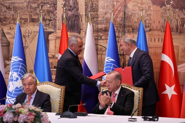 这是俄乌双方首次公开签署协议。俄罗斯国防部长绍伊古和乌克兰基础设施部长亚历山大·库布拉科夫(Oleksandr Kubrakov)出席了签字仪式,但俄乌双方并未坐在同一谈判桌上,而是分别与土耳其和联合国签署了从乌克兰港口安全运输粮食的倡议。