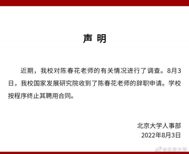 中国青年报客户端北京8月3日电(中青报·中青网记者 叶雨婷)今天,北京大学人事部针对该校教授陈春花“学历疑造假”一事发布声明称:近期,该校对陈春花老师的有关情况进行了调查。8月3日,该校国家发展研究院收到了陈春花老师的辞职申请,学校按程序终止其聘用合同。