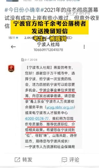 宁波市人力资源和社会保障局在短信中表示:“宁波企事业单位求贤若渴,向您发出诚挚邀请,请登录‘甬上乐业’宁波市人力资源综合服务平台或来电宁波市人才服务中心,我们将为您提供专员服务,推荐优质职位,介绍政策。希望您在宁波找到‘位’、寻到‘味’,期待您与宁波共成长!”这段话看似寻常,但对落榜的考公者来说,却是极大的安慰。对于官方的表示,有收到短信的考生也表达了感谢,并十分感动地说:“省考落幕,虽然面试没有成功上岸有些小难过,但意外收到贴心的短信,被这座城市‘暖’到了。”
