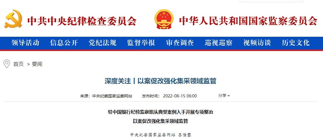 这次中央纪委国家监委网站在文章中特别披露:针对案件中林传伟利用分管集中采购业务的职务便利为他人谋取利益问题,2021年12月至2022年9月,驻中行纪检监察组会同中行党委在全行推动开展集采领域专项整治。