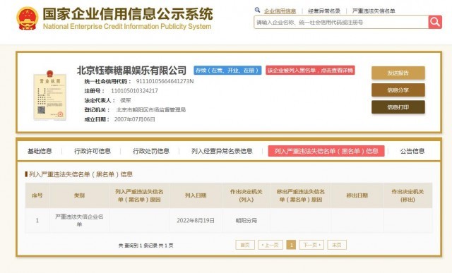 中新网8月25日电 据国家企业信用信息公示系统显示,近日,北京钰泰糖果娱乐有限公司被列入严重违法失信企业名单。