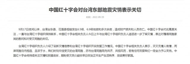中新网9月19日电 据中国红十字会网站消息,9月17日夜间以来,台湾台东县、花莲县相继发生6.5级、6.9级地震和多次余震,造成财产损失和人员伤亡。中国红十字会对此高度关注,一直与台湾红十字组织保持联系,中国红十字会相关负责人今日上午与台湾红十字组织负责人通话进一步了解灾情,表达对罹难同胞家属的慰问和对受灾同胞的关切。