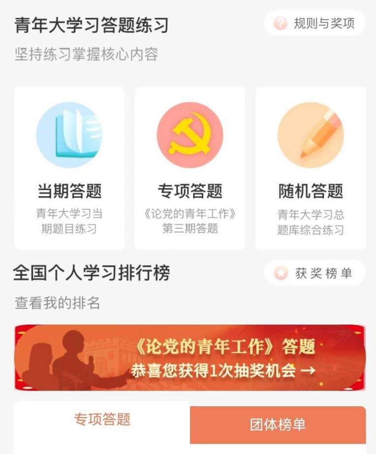 即日起,《论党的青年工作》学习答题活动进入抽奖阶段。三期答题积分总榜中,获得前三名的团体用户可以进行一次抽奖(系统会自动发送抽奖链接到用户答题页面,如下图所示),并有机会获得中国青年报文创“青年印象”礼盒、蓝牙音箱等奖品。