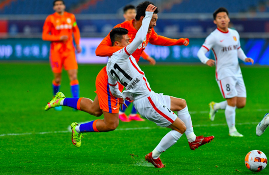 11月12日,山东泰山队4∶0战胜河北队成为联赛领头羊。图为山东球员郭田雨(上)和河北球员崔麟(下)在比赛中争球。新华社记者 朱峥/摄