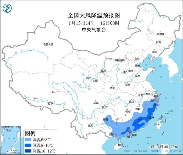 受冷空气影响,预计,1月15日14时至1月16日08时,江南中东部和南部、华南大部、贵州南部等地将出现6~8℃降温,其中江西南部、福建西南部、浙江南部等地局地降温幅度可达10℃。16日至17日早晨,最低气温0℃线将位于云南东部至贵州南部、湖南南部、江西中部、福建北部一线。江南、华南等地有4~5级偏北风,沿海地区风力可达5~6级,阵风7级左右。我国近海大部海域有6~8级风,其中台湾海峡部分海域有9级风,阵风可达10级。
