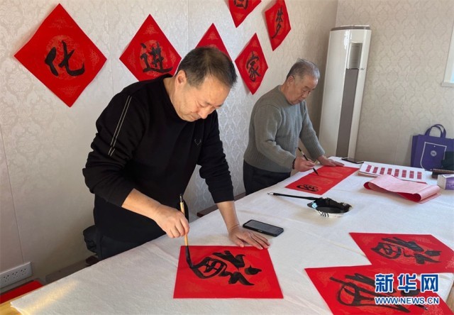 乌苏市书法协会老师现场写春联。新华网发 张婧摄