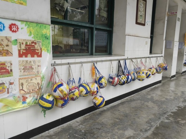 大石背后,是学校的教学楼,仅有3层高,修建于20世纪90年代,外墙经过岁月的洗礼有些老旧发黄。最引人注意的是,每个教室窗户外都有一根长长的不锈钢挂架,上面整整齐齐钉着挂钩,每个挂钩上悬挂着一个排球网兜,里面是颜色不同的排球,每个排球上还用彩色笔写着主人的名字。不少排球上有明显的磨损痕迹,显然是使用比较频繁导致。