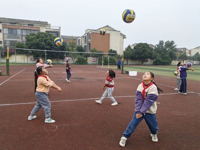 叮铃铃……10点20分,上午大课间的铃声响起,只见孩子们从教室里走出来,每个人都从自己的网兜里拿出排球,一边流畅地垫球,一边往大操场跑去。