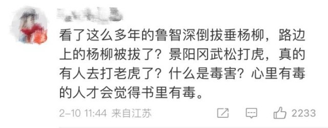 有网友灵魂反问:“看了这么多年的鲁智深倒拔垂杨柳,路边上的杨柳被拔了?景阳冈武松打虎,真的有人去打老虎了?”
