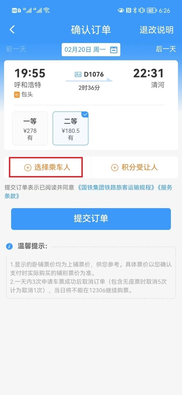选定车次后进入预定页面,点击“选择乘车人”即可。