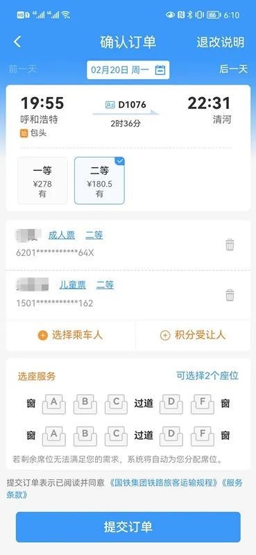 首先,在铁路12306App上将免费乘车儿童添加为乘车人。