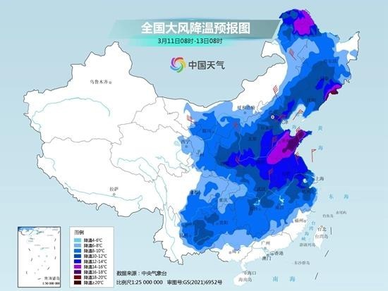 但周末开始,随着寒潮东移南下,中东部将自北向南陆续加入气温“大跳水”行列。中央气象台预计,3月11日至13日,中东部大部地区气温下降6~10℃,华北、黄淮、江淮等地气温下降12℃,局部超过16℃。