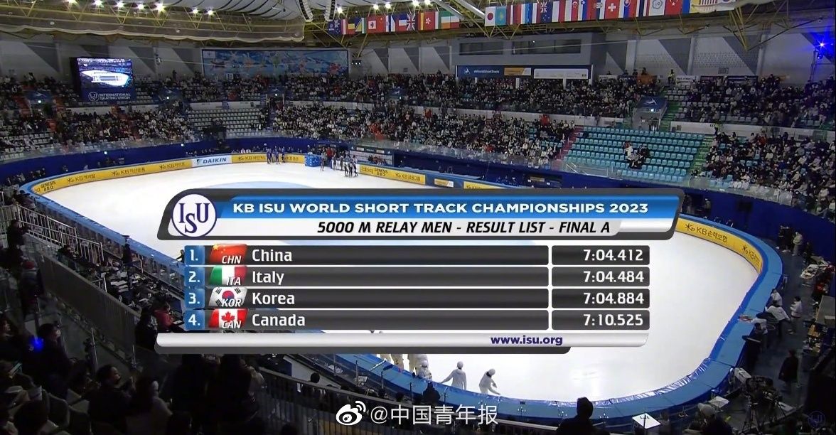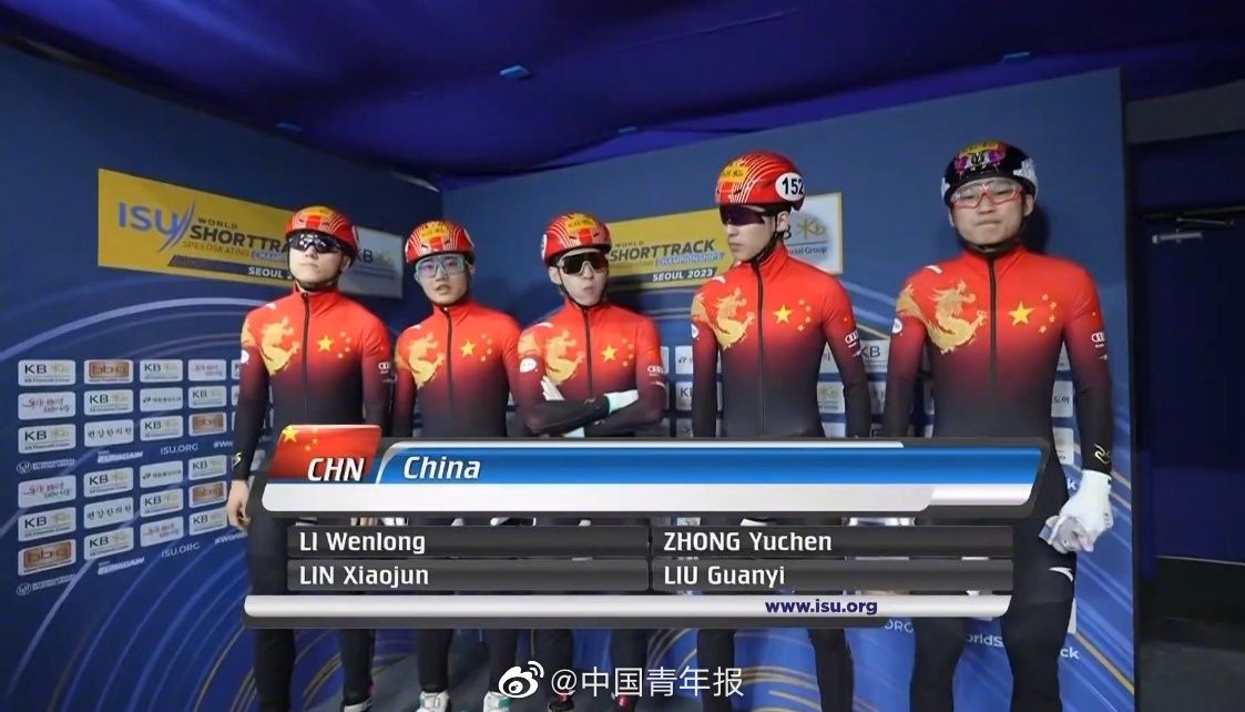 2023短道速滑世锦赛今天在韩国首尔进入最后一个比赛日,在压轴进行的男子5000米接力决赛A组的比赛上,由钟宇晨、林孝埈、李文龙、刘冠逸组成的中国队,后程发力。在比赛最后阶段,四队的竞争进入白热化,中国队利用对手发生碰撞的机会,冲至第一的位置,并保持到终场。四名小伙为中国队夺得本届短道速滑世锦赛的第一枚金牌。意大利队和韩国队分别获得男子5000米接力的第二和第三名。(中青报·中青网记者慈鑫,图片:视频截图)
