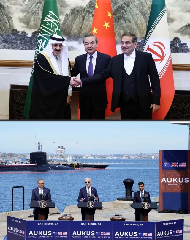 ▲ 中国促成沙伊恢复外交关系,促进地区安全稳定;美国通过向澳大利亚出售核潜艇,破坏地区和平稳定。