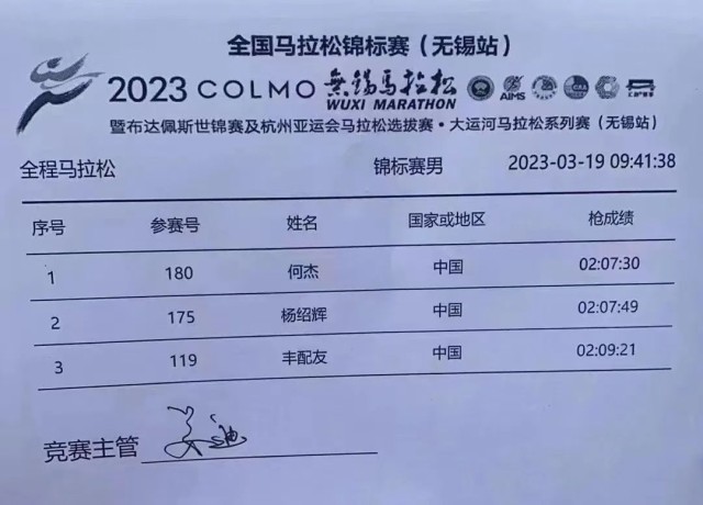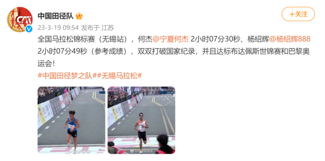 今天上午,全国马拉松锦标赛(无锡站),何杰(2小时07分30秒)和杨绍辉(2小时07分49秒)双双打破国家纪录,并且达标布达佩斯世锦赛和巴黎奥运会!