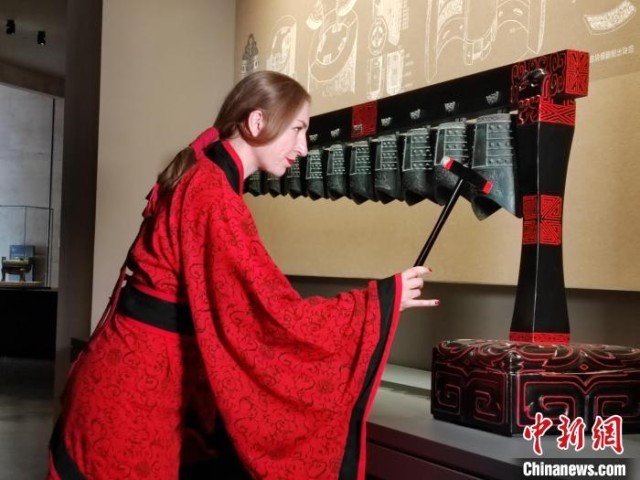山西青铜博物馆内,金发碧眼的摩尔多瓦外教伊莉娜,身着一袭红色曲裾汉服,敲打编钟仿制品。 高雨晴 摄