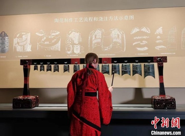 中新网太原3月23日电(高雨晴 胡健)“说起中国的古代乐器,你最熟悉的有哪些呢?今天我要带你来看看古代的乐器之王——编钟……”23日,山西青铜博物馆内,金发碧眼的摩尔多瓦外教伊莉娜,身着一袭红色曲裾汉服,一边敲打编钟仿制品,一边用一口流利的中文,在镜头前绘声绘色地介绍中国青铜文化。