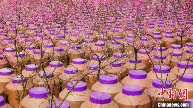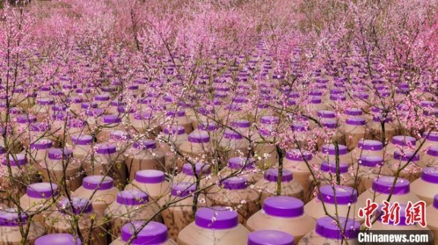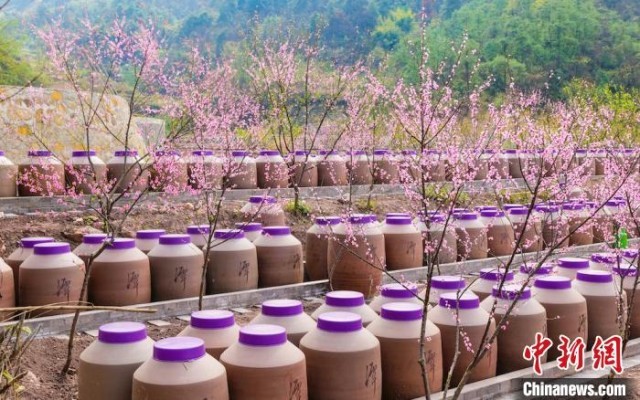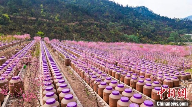 眼下正是桃花盛开的季节,也是最适合赏花、品酒的时节。在四川省泸州市古蔺县太平镇仙潭酒厂,远远看去,厂区桃花坡里一株株桃花竞相绽放,伴随着桃花香,还有一股令人心旷神怡的酒香飘过。