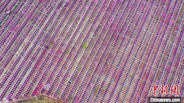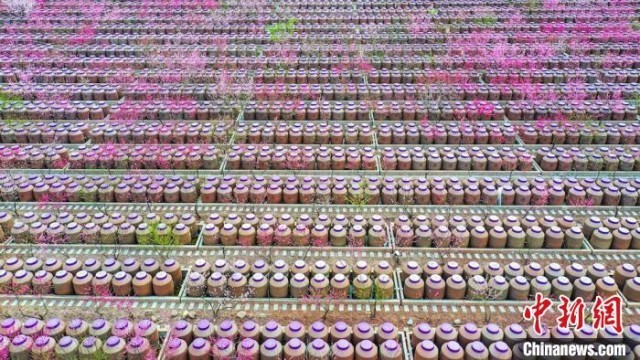 诗话般的桃花林,树底下陈列着一排排酒坛,桃花吐露芬芳,美酒微风拂面。桃红色、粉红色、紫色层层叠叠,相得益彰。