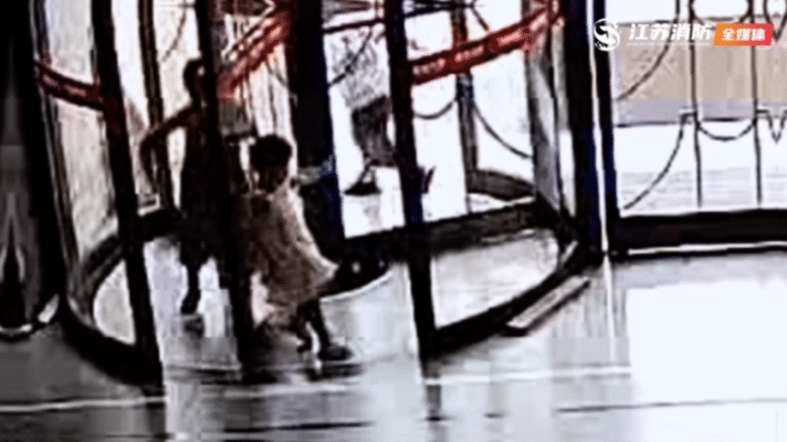 △小孩在大厅旋转门中玩耍,摔倒后右脚卡在大厅的旋转门中。