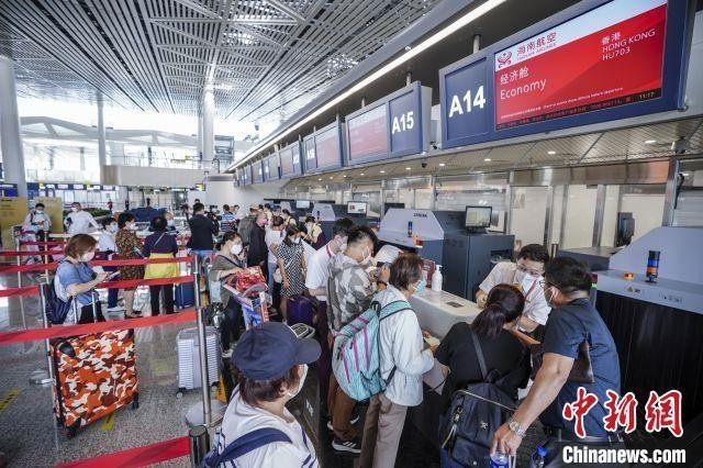 资料图:海口美兰机场,旅客正在办理手续。 骆云飞 摄