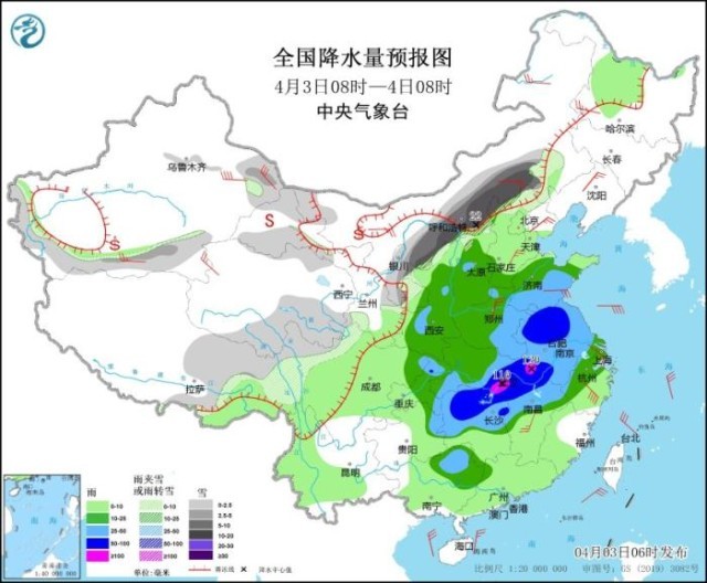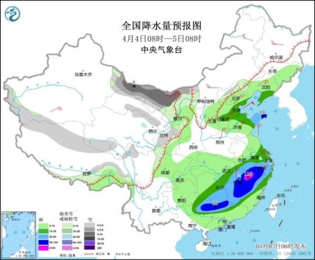 图3 全国降水量预报图(4月3日08时-4日08时)