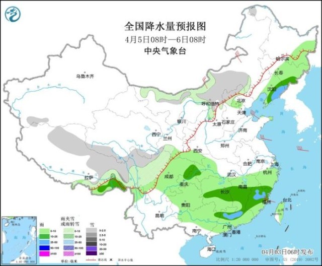 图5 全国降水量预报图(4月5日08时-6日08时)