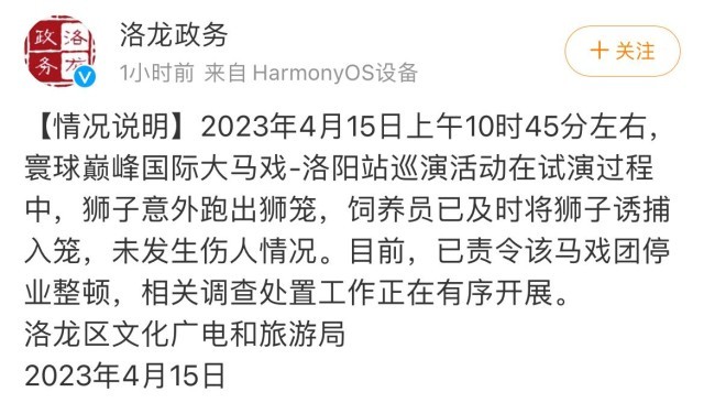 4月15日,河南省洛阳市洛龙区文化广电和旅游局就网络上一段狮子在停车场行走的视频发布通报:2023年4月15日上午10时45分左右,寰球巅峰国际大马戏-洛阳站巡演活动在试演过程中,狮子意外跑出狮笼,饲养员已及时将狮子诱捕入笼,未发生伤人情况。目前,已责令该马戏团停业整顿,相关调查处置工作正在有序开展。