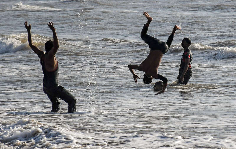 4月22日,印度孟买,民众跳入海水中解暑。 图片来源 视觉中国