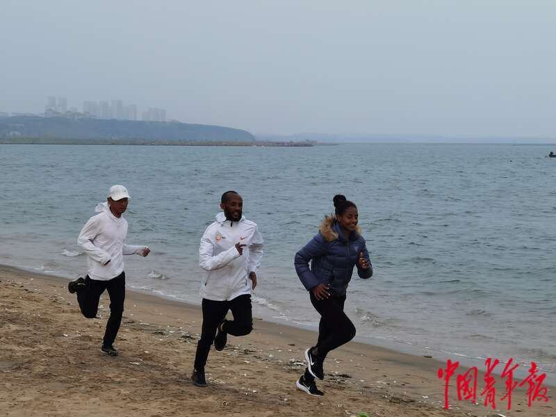 4月28日,山东荣成,来自埃塞俄比亚的特斯法拉姆·梅哈里(中)和米莎·伊美尔(右)和他们的领队在海边跑步。梅哈里是第三次来中国,马拉松最好成绩是2小时11分多,在即将举办的2023荣成滨海马拉松比赛中,他希望向冠军发起冲击。