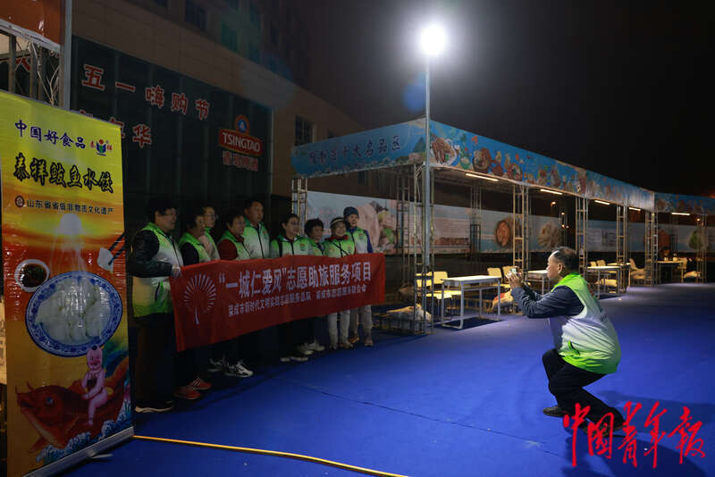 4月28日,山东荣成,荣成市体育中心,美食街现场的一队助旅服务志愿者在合影。中青报·中青网记者 曲俊燕/摄