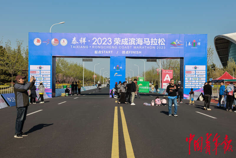 4月29日,山东荣成,赛道封闭前,人们在赛事起点打卡拍照。中青报·中青网记者 曲俊燕/摄