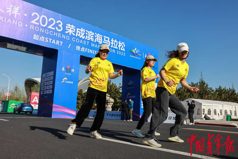 4月29日,山东荣成,3名参加欢乐跑的选手在赛事起点跳舞并录制短视频。4月30日即将举行的2023荣成滨海马拉松包含三个项目,分别是全程马拉松、半程马拉松和7公里的欢乐跑。中青报·中青网记者 曲俊燕/摄