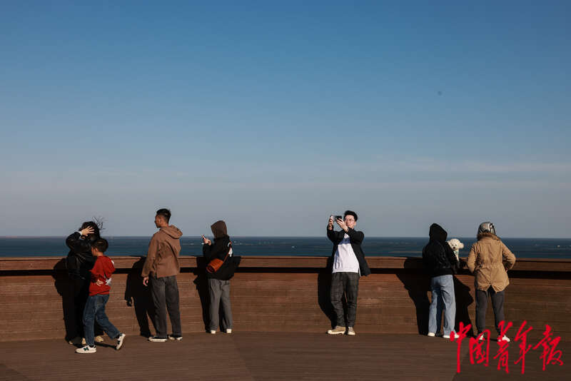 4月29日,山东荣成,人们在荣成市少年宫楼顶观海景。一旁不远处就是荣成滨海马拉松的起点,赛道沿线几乎全程可以看到海景。中青报·中青网记者 曲俊燕/摄