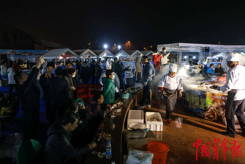 4月28日,山东荣成,荣成市体育中心,“相约荣马 惠聚荣成”五一嗨购节暨荣成青岛啤酒海鲜美食嘉年华现场,一口直径6米多的海鲜大锅吸引了许多市民和游客。中青报·中青网记者 曲俊燕/摄