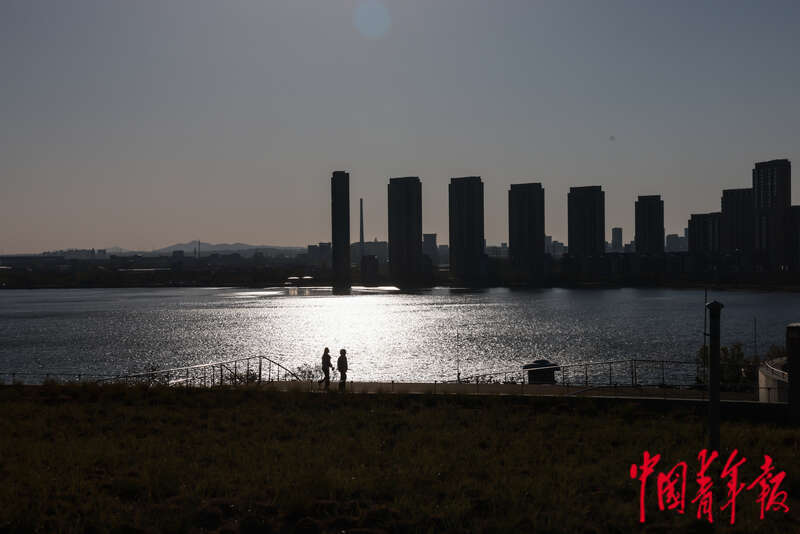 4月29日,山东荣成,樱花湖体育公园旁,两名游人在散步。中青报·中青网记者 曲俊燕/摄