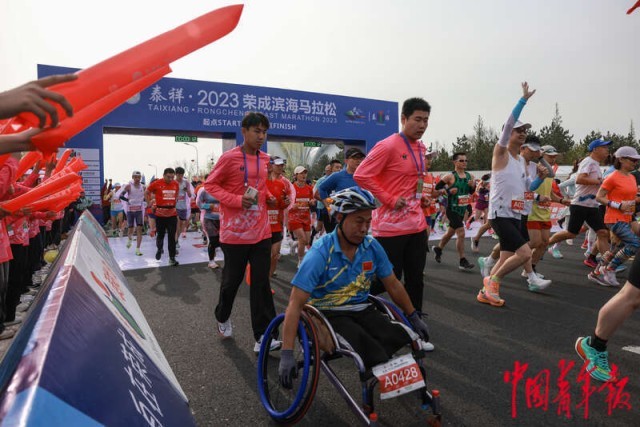 4月30日早上7点30分,山东荣成,2023荣成滨海马拉松鸣枪起跑。国内外的12000余名跑友齐聚荣成,在“最美赛道”上尽情奔跑,领略这座海滨小城的魅力。比赛分为全程、半程马拉松赛及欢乐跑三个组别,赛事起终点设在荣成市体育中心,比赛路线将樱花湖、桑沟湾湿地公园、十里河公园、滨海公园等当地特色地标“串连成珠”,选手在奔跑过程中,也将荣成秀美的景色尽收眼底。荣成滨海马拉松比赛曾在2017-2019年连续举办3届,因疫情停办3年后,今年重新回归。中青报·中青网记者 曲俊燕/摄