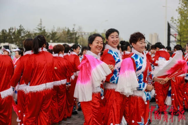 4月30日,山东荣成,2023荣成滨海马拉松赛开幕式上,参加文艺演出的市民们。中青报·中青网记者 曲俊燕/摄