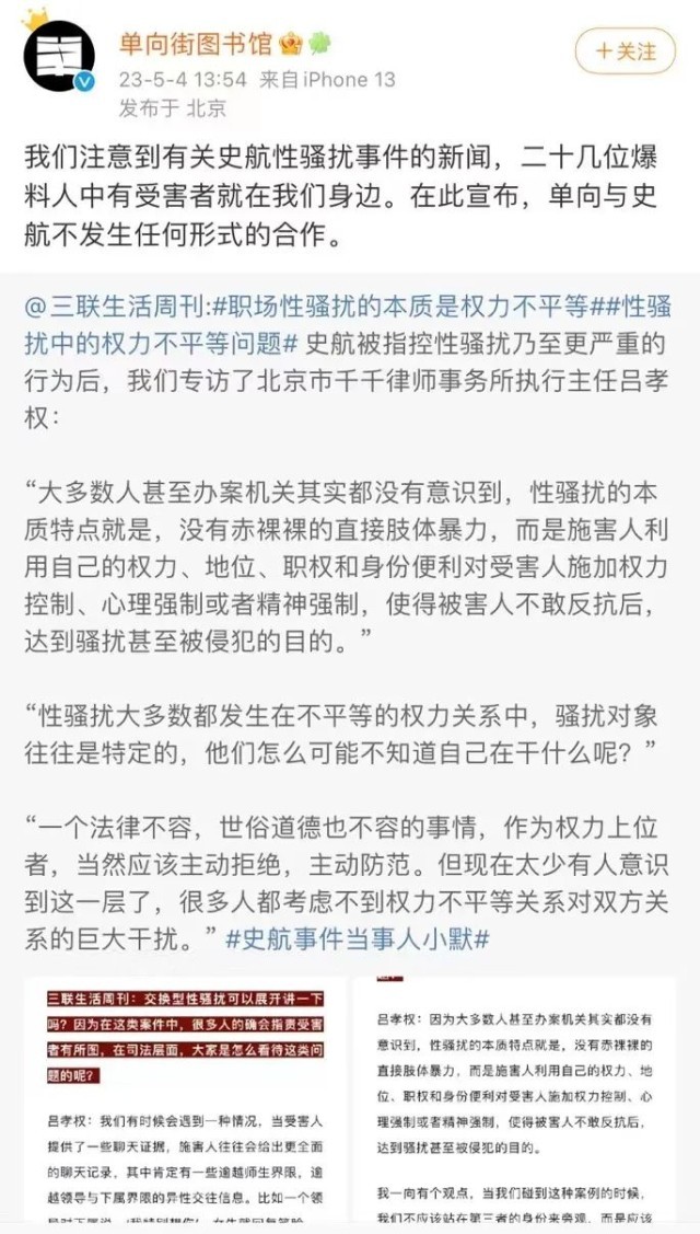 多位女性在网上指证编剧史航涉嫌性骚扰,史航两次回应后,引发的关注仍在持续。继磨铁图书和《新周刊》与史航终止合作关系后,5月4日,单向街图书馆在微博发布声明:“我们注意到有关史航性骚扰事件的新闻,二十几位爆料人中有受害者就在我们身边。再次宣布,单向与史航不发生任何形式的合作。”