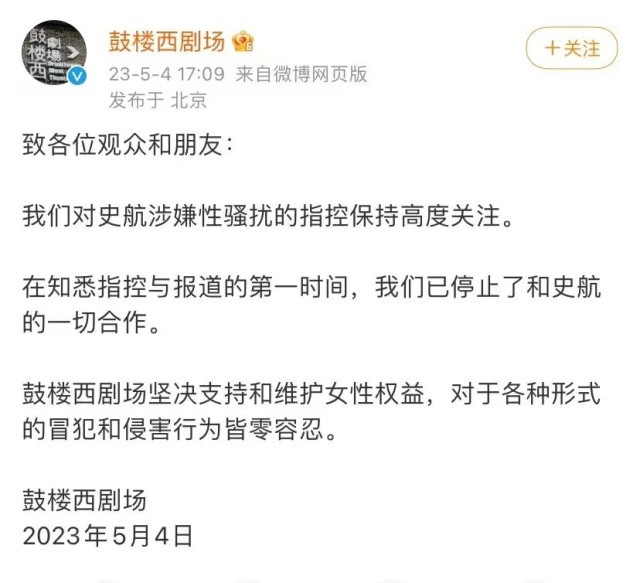 单向街图书馆声明同日,鼓楼西剧场也发表声明:“我们对史航涉嫌性骚扰的指控保持高度关注。在知悉指控与报道的第一时间,我们已停止了和史航的一切合作。鼓楼西剧场坚决支持和维护女性权益,对于各种形式的冒犯和侵害行为皆零容忍。”