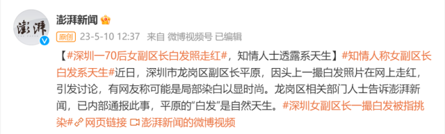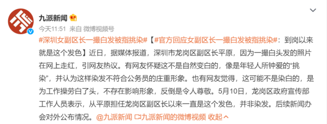 近日,深圳市龙岗区副区长平原因部分头发为白色的照片引发关注。